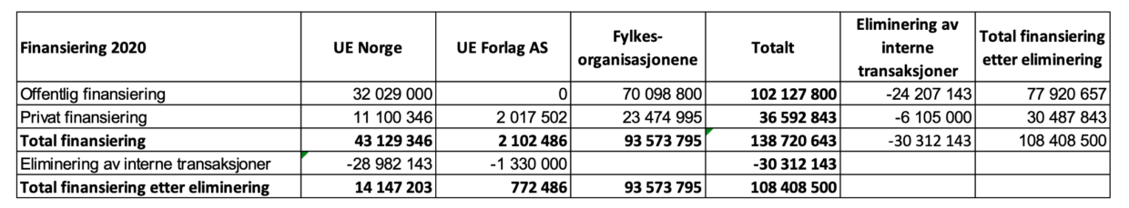 Interne transaksjoner er eliminert for å vise netto finansiering. Transaksjonene består av internfakturering og finansiering UE Norge mottar og videreformidler til fylkesorganisasjonene og UE Forlag AS.