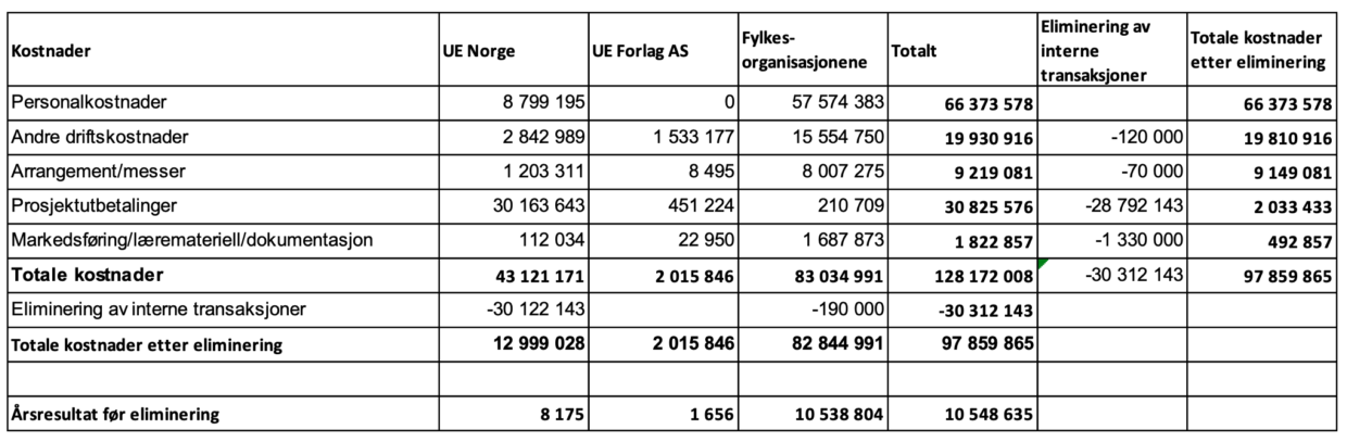 Interne transaksjoner er eliminert for å vise netto kostnader. Transaksjonene består av internfakturering og finansiering UE Norge mottar og videreformidler til fylkesorganisasjonene og UE Forlag AS.