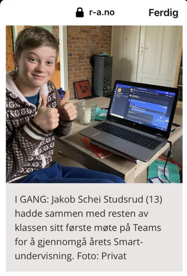 Da pandemien slo oss var elever fra Rakkestad de aller første til å prøve SMART-undervisning på nett. - Vi starter dagen med et møte på Teams hvor vi snakker om hvordan vi skal jobbe sammen framover, forteller Jacob Shei Studsrud (13) som går i sjuende klasse på Bergenhus skole. Grunnskoleansvarlig i Viken, Irene Bergsland var primus motor for å få gjennomføringene i Rakkestad over på nett. Takket være samarbeidsvillige lærere og motiverte elever var elevene raskt i gang.