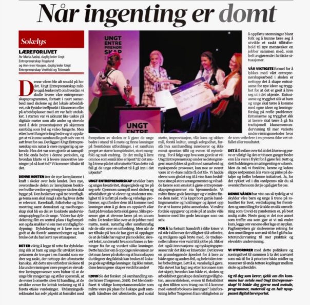 Dette beskriver godt hva de som ansatte har blitt utfordret på dette året.Jeg er så ydmyk og takknemlig for hvordan de kastet seg rundt, tok regi og på kort tid utviklet digitale mesterskap som skapte stort ungdomsengasjement, en digital læringsuke som ble et nasjonalt event og øvrig digitalt materiell og oppfølgingsopplegg slik at de overarbeidende lærerne maktet å motivere sine elever til selv å se muligheter for deres gode idéer.