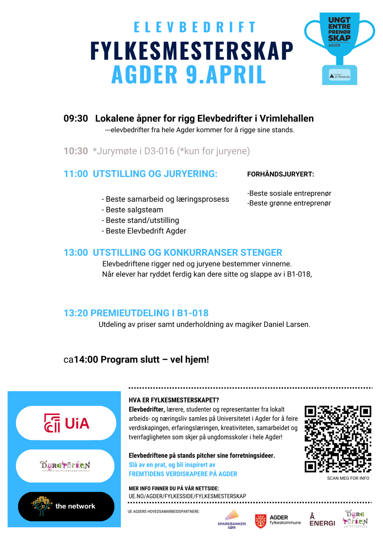 Program Fylkesmesterskapet for elevbedrifter på Universitetet i Agder 09.april 2025