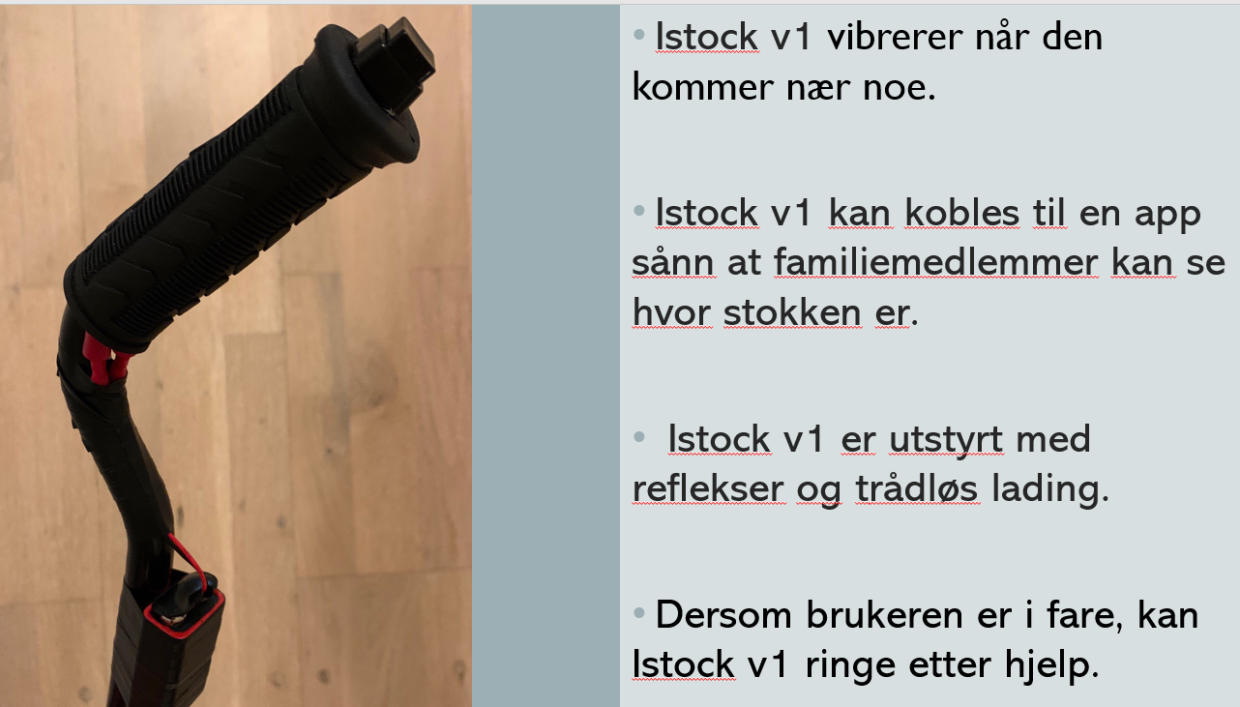 iStock V1 er et hjelpemiddel for blinde og svaksynte, forklarer Sara Margrethe Næss, Tobias Dyrseth Larsen, Marcus Leander Kolverud og Magnus Gaarder Lie i sin presentasjon. Håndtaket vibrerer før man treffer noe, slik at brukeren kan gå trygt. I tillegg er iStock utstyrt med GPS, slik at den blinde kan bli funnet dersom man har gått seg bort. Oppfinnelsen lar også brukeren komme i kontakt med nødetaten hvis uhellet skulle være ute. Og selvsagt bidrar iStock V1 til flere av FNs bærekraftsmål, blant annet god helse og mindre ulikhet. -Vi har lært at man jobber mye bedre når man jobber sammen, sier de stolte vinnerne.