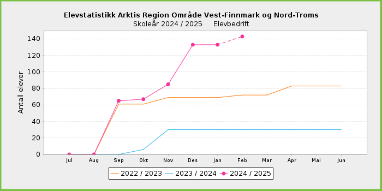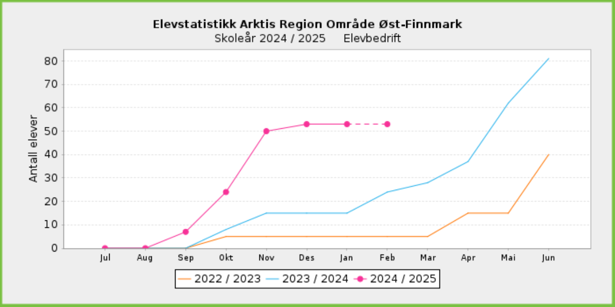Etter pandemiårene og noen år med utveksling i personell i Finnmark begynte vi virkelig å se effekten av arbeidet som legges inn i regionen, spesielt på elevbedriftsprogrammet. I 2024 var det registrert høyere elevtall for bedriftsprogrammet i både Øst-Finnmark og Vest-Finnmark enn det har vært på mange år. I løpet av høstsemesteret var det rundt 200 elever i Finnmark som hadde startet elevbedrifter - en tredobling fra samme tidspunkt året før, og en kontiuerlig økning siden 2022.