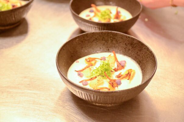 Blomkålsuppe toppet med kantareller, lilla blomkål og hjemmelagde brødkrutonger.