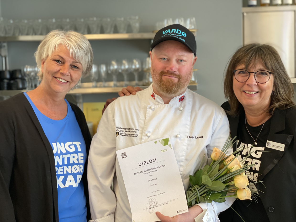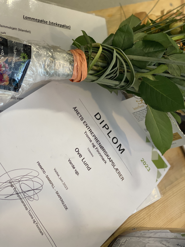 Tirsdags formiddag hadde vi gleden av å overrekke kake og blomster til en veldig overrasket og blid lærer på Vardø videregående skole. Ove Lund, en dedikert lærer på restaurant- og matfagslinja på Vardø vgs, har blitt utpekt som årets entreprenørskapslærer for sitt utrettelige arbeid med å inspirere og veilede elevene i klasserommet - og på kjøkkenet.