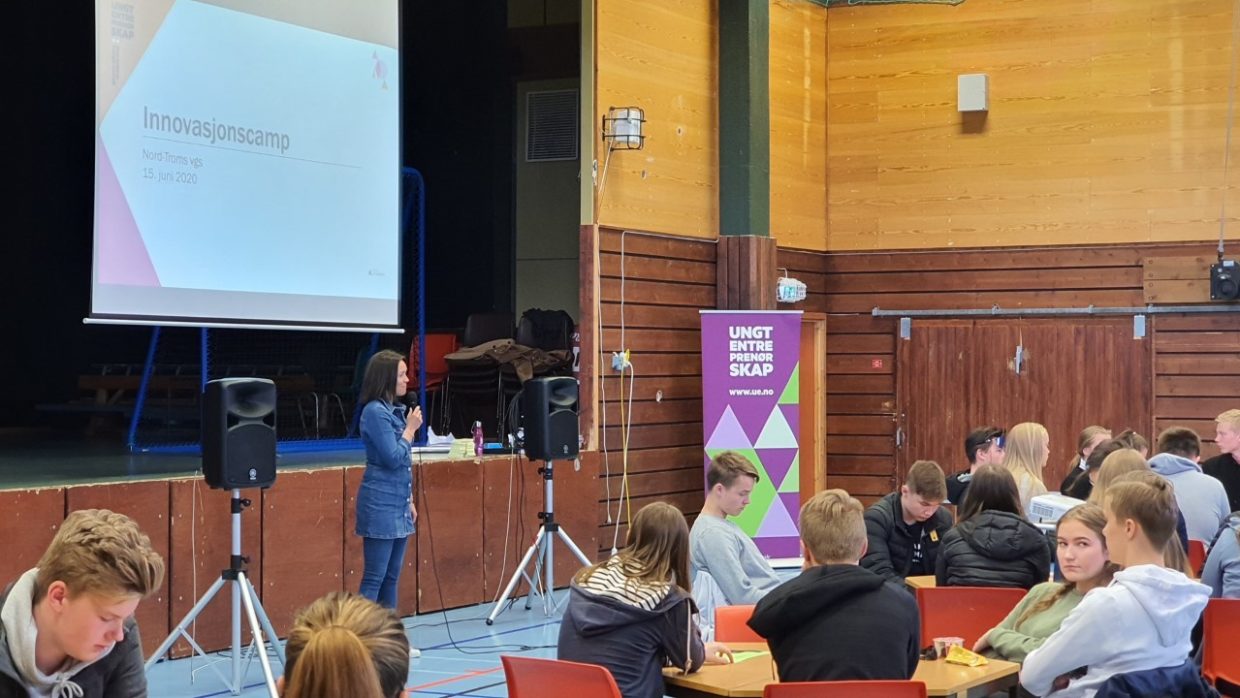 Ordføreren i Nordreisa Kommune, Hilde Nyvoll åpnet dagens Innovasjonscampen på Storslett VGs. Foto: Ungt Entreprenørskap Troms