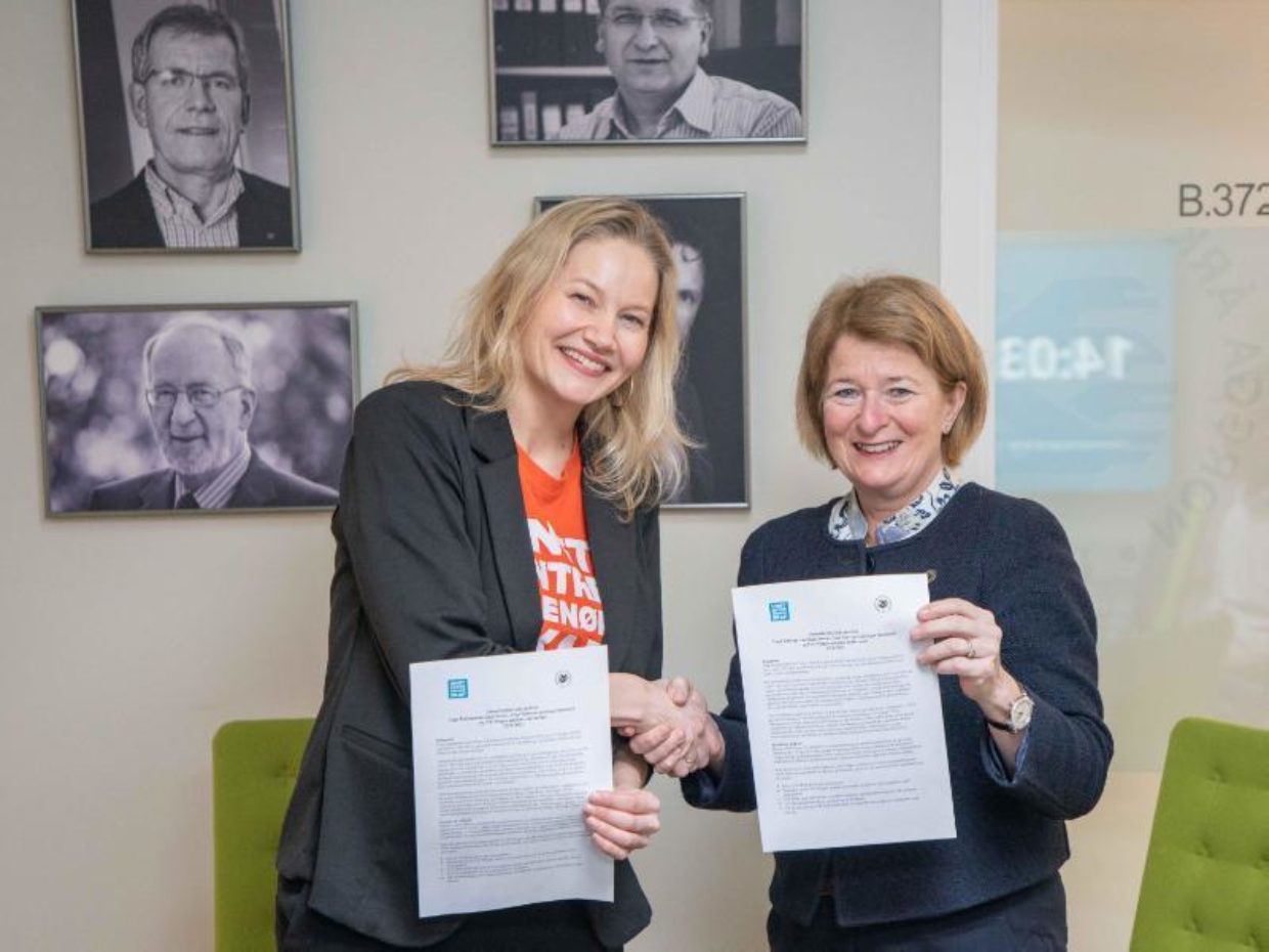 Liv Brandvoll (t.v.) og Anne Husebekk signerte i dag en samarbeidsavtale mellom Ungt Entreprenørskap og UiT. Daglig leder fra UE Finnmark, Svein Tore Dørmænen, var ikke til stede under signeringsmøtet. Foto: Jonatan Ottesen