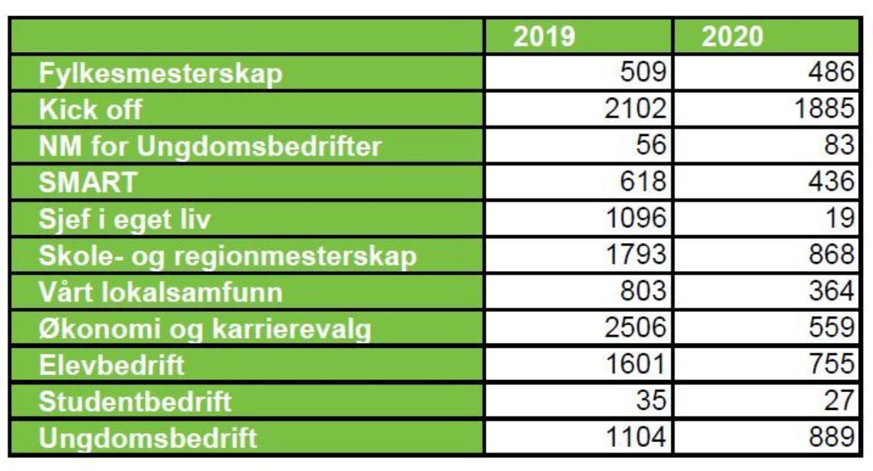 Det er også verdt å merke seg at det har blitt laget mange digitale tilbud på tvers av fylker i 2020. Dette er f.eks. digitalt kick-off, kurs i forretningsplan, digital markedsføring, videopitch osv. Flere av disse kursene er distribuert som opptak til skolene, og lærerne har brukt dem når det passer inn i undervisningen. Derfor kan det være mange elever som har deltatt i disse kursene uten at dette reflekteres i aktivitetstallene.