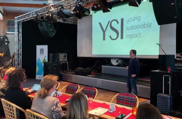 Tre eksterne innledere var invitert på lærersamlingen for å gi lærerne faglig påfyll og inspirasjon. Først ut var Didrik Strøhm fra Young Sustainable Impact (YSI). Han snakket om bærekraft, om sin erfaring med å jobbe i en organisasjon som YSI og om unges muligheter i det grønne skiftet.