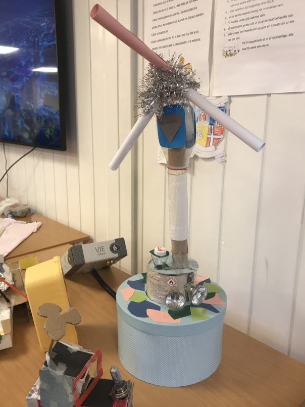 Et viktig element i SMART er at elevene også skal jobbe kreativt med å lage en modell av ideen sin. Dette skjer på den andre dagen, og elevene i Torpa bygget flotte prototyper av ulike materialer de hadde samlet på forhånd. De skulle også finne fem faktaopplysninger for å forklare hvorfor dette var en god idé.