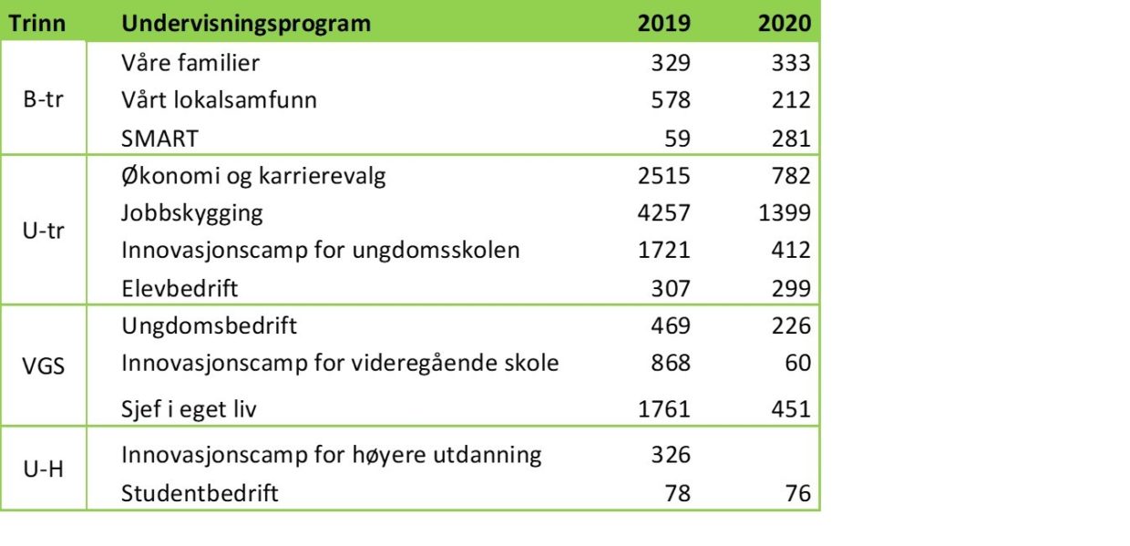 Som vi ser hadde flere av programmene en nedgang i 2020, og det er liten tvil om at koronapandemien er en medvirkende årsak til nedgangen. Arbeidssituasjonen og skolehverdagen til lærere og elever ble brått endret, og flere UE-aktiviteter har enten ikke praktisk latt seg gjennomføre eller blitt utsatt i en skolehverdag som har blitt snudd på hodet.