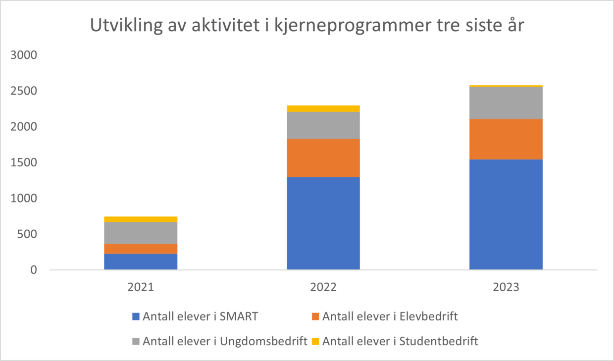 Figuren nedenfor viser utviklingen i antall elever som gjennomfører kjerneprogrammene SMART, Elevbedrift, Ungdomsbedrift og Studentbedrift de siste 3 år.