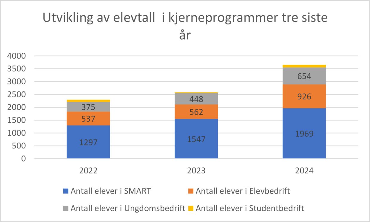 Figuren nedenfor viser utviklingen i antall elever som gjennomfører kjerneprogrammene SMART, Elevbedrift, Ungdomsbedrift og Studentbedrift de siste 3 år.