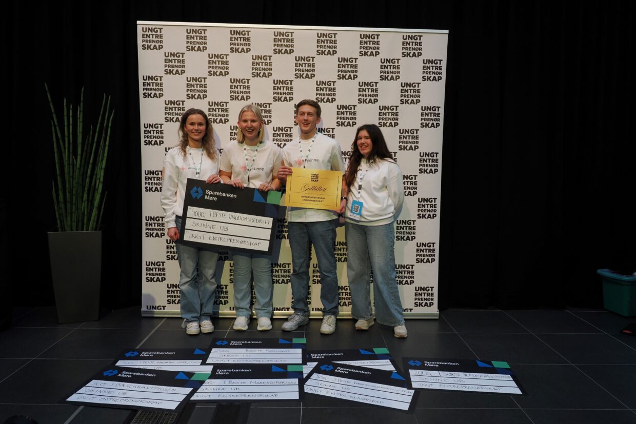 Skinne UB produserer innovative, sirkulære og tidsriktige løsninger ved å nyttiggjøre fiskeskinn for et miljøengasjert marked. Ungdommene går Innovasjon og ledelse ved Molde videregående skole, og skal representere Møre og Romsdal i NM for Ungdomsbedrifter 2024.