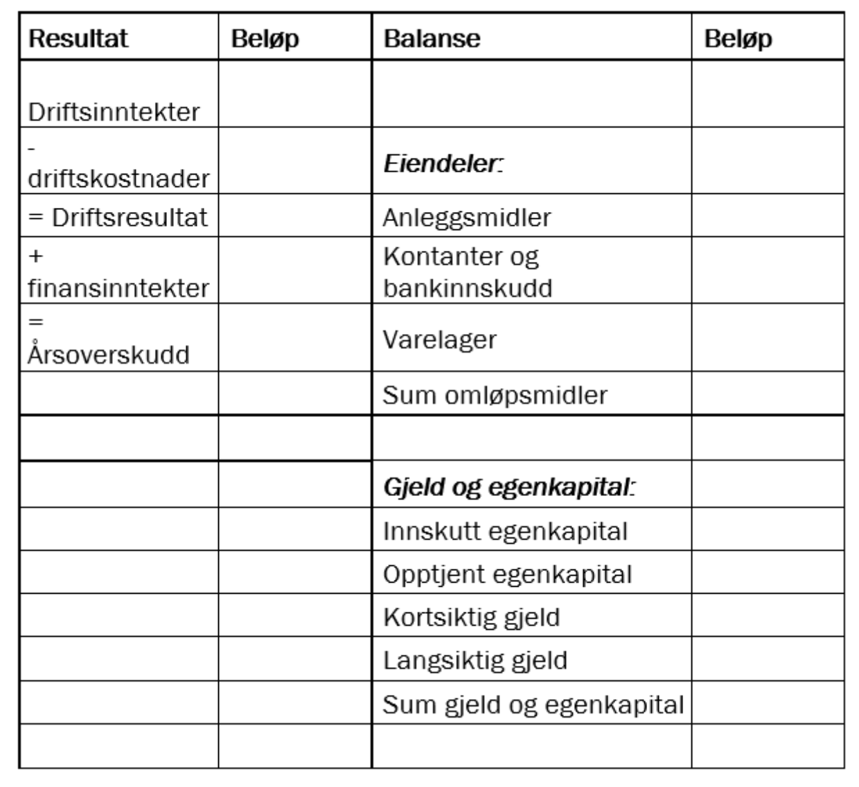 Regnskapsoppstillingen må minimum inneholde følgende: