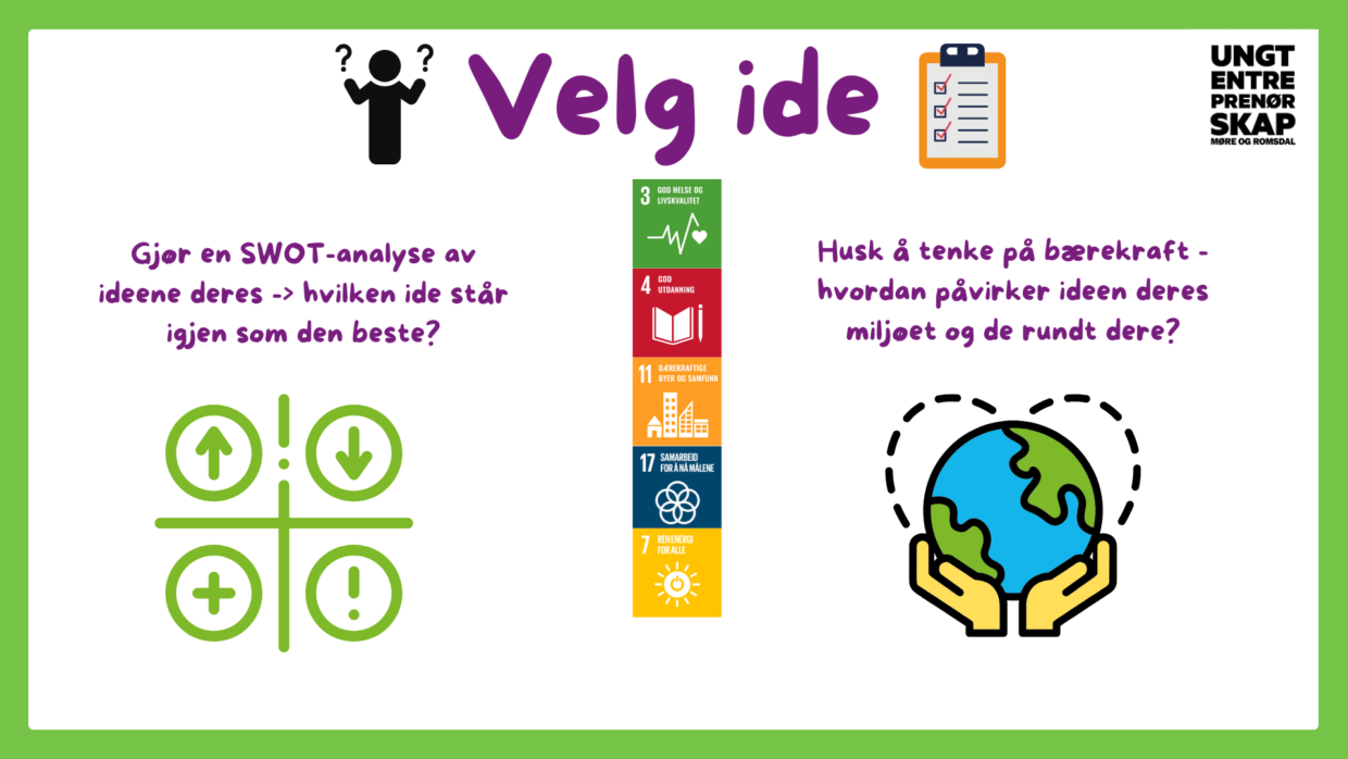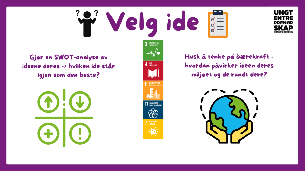 2. Se på de tre utvalgte ideene og bruk Arbeidsark 2 til å gjøre en SWOT-analyse for å diskutere fordeler og ulemper ved disse ideene. Er det noen som stikker seg ut? Bli enig på gruppa hvilken idé dere skal jobbe videre med.