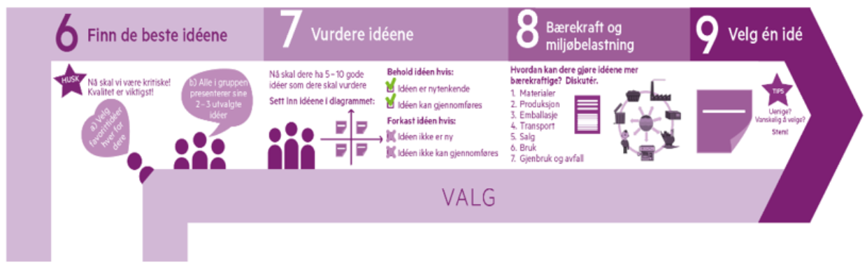 I denne fasen skal dere vurdere ideene dere har kommet opp med og velge den ideen dere synes er best. Her må dere være litt kritiske og gjøre noen valg og prioriteringer for å finne det som skal bli det endelige løsningsforslaget deres.