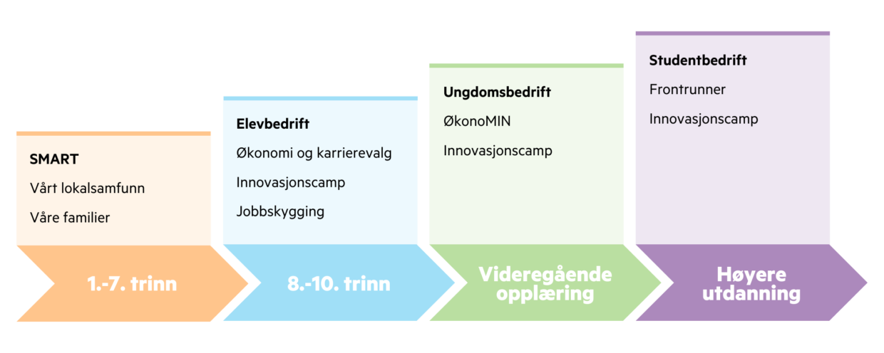 Vi har programmer fra grunnskole til høyere utdanning, innen områdene entreprenørskap, jobbtrening og personlig økonomi.