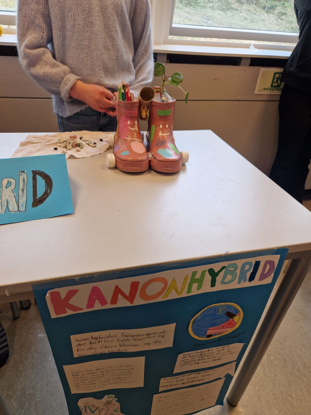 Ideene var varierte og kreative! Kanskje vi i framtiden kan se en Kanonhybrid laget av gamle støvler, en Sokkesorteringsmaskin av et trappetroll, eller en gammel hodelykt med regnbuelys som vil gjøre hverdagen din mer fargerik? Elevene har løst små og store problemer ved hjelp av gamle ting de fant hjemme – framtidens ombruk ser lys ut!