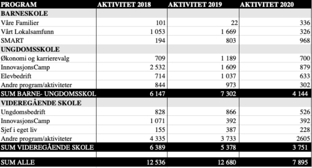 Utfordringene knyttet til pandemien har gjort at vi må tenke nytt og kreativt for å gjennomføre våre programmer ute i skolene. I løpet av året har vi bygget digital kompetanse, omstilt oss i takt med raske endringer og nådd ut til elever og lærere fra barnehage til videregående skole. Utfordringer tilknyttet pandemien og implementering av fagfornyelsen viser at entreprenørskap i skolen er viktigere enn noen gang. Det handler om å gi elevene erfaringer og verktøy som problemløsere for å styrke fremtidens verdiskapere. Hele 22 Nordlandskommuner ser viktigheten av dette og har tegnet medlemskap med Ungt Entreprenørskap i løpet av 2020.