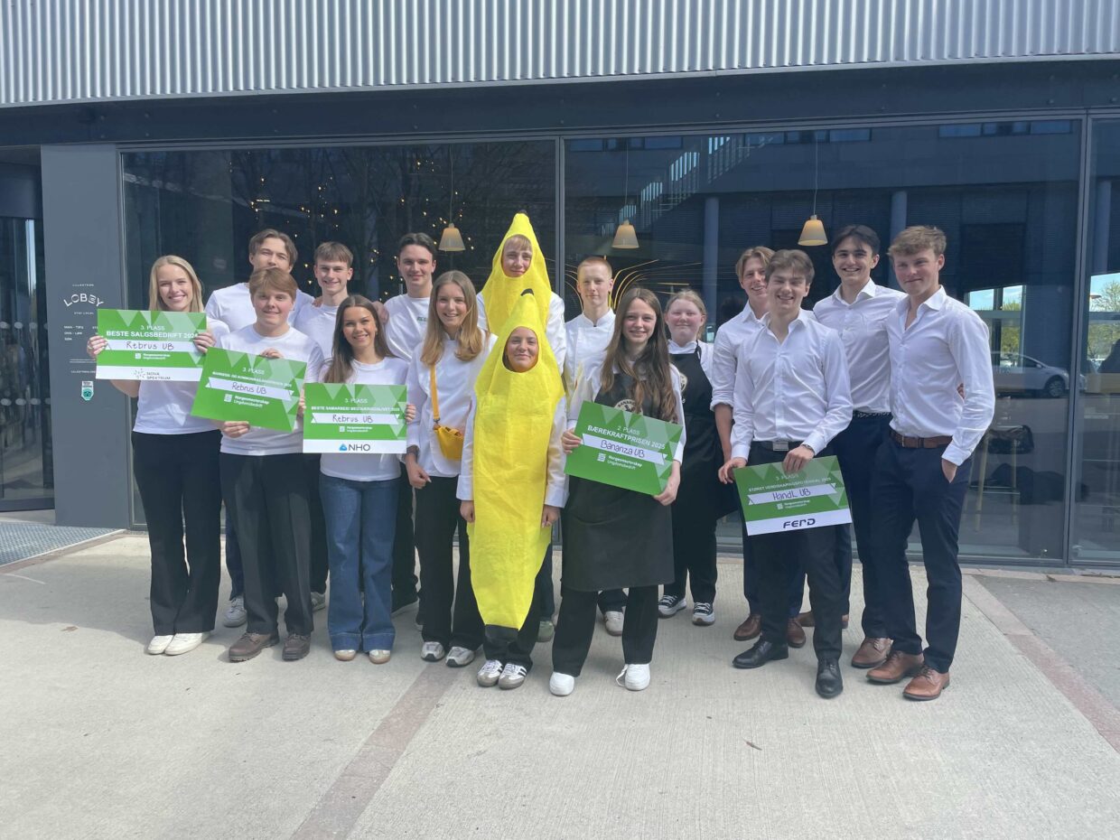 Vg1 elevene fra Restaurant-og matfag gikk av med seieren som Nordlands beste ungdomsbedrift i 2025, og leverte en strålende pitch på NM-scena foran 600 tilskuere. De tok stolt med seg 2.plassen i Bærekraftprisen hjem.