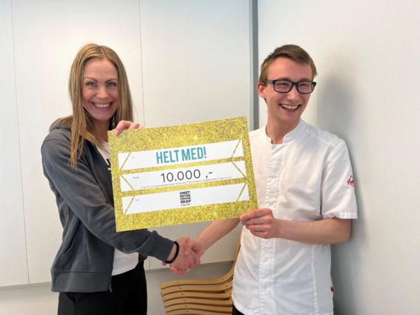 Simen tar stolt i mot gavesjekken på vegne av Helt Med i Bodø, som alltid med et smil.