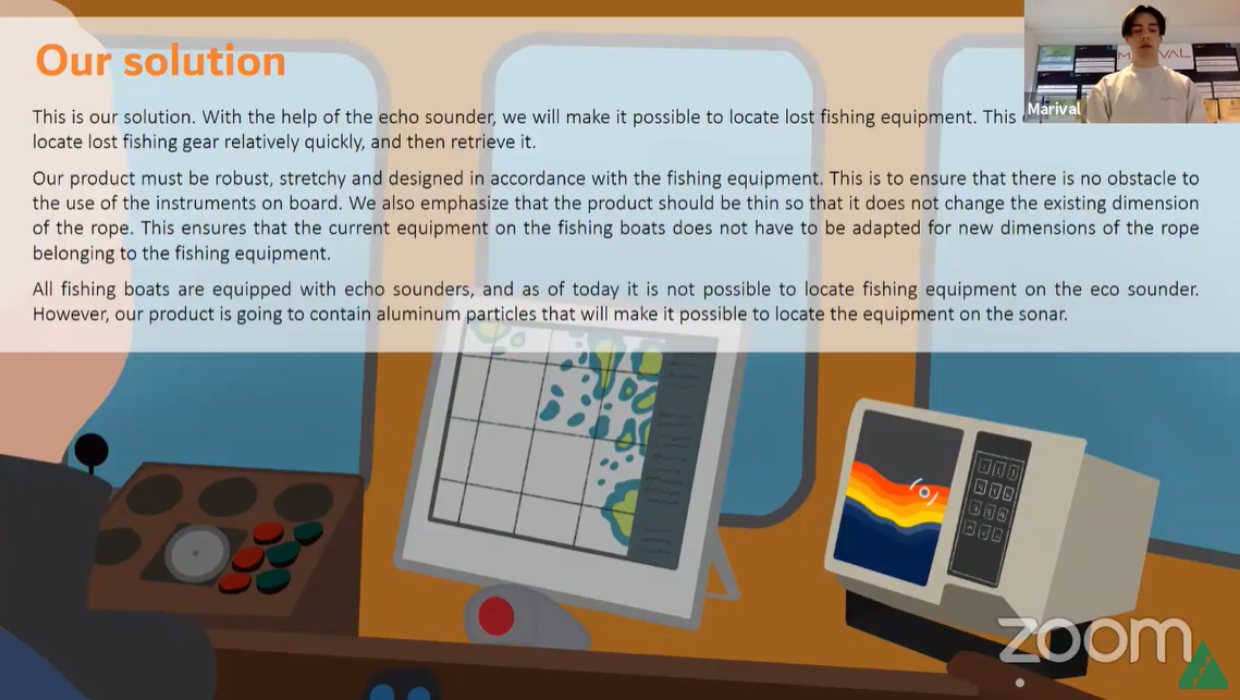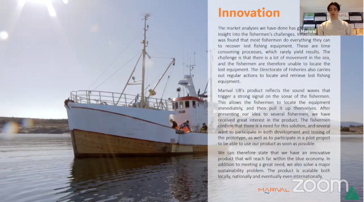 Marival UB fra Møre og Romsdal tok hjem den høythengende førsteplassen i den europeiske konkurransen "Euronext Blue Innovation Award" tirsdag 8. juni. Med Marival UB sitt produkt skal fiskebåter og fiskere kunne lokalisere tapt fiskeutstyr ved at produktet kobles opp til ekkoloddet som allerede finnes i fiskebåtene. Ungdomsbedriftens mål er å redusere marin forsøpling og gjøre den maritime næringa mer bærekraftig. Den europeiske juryen ble mektig imponert over den norske ideen og potensialet som ideen har: - Very technical solution. Great presentation, framing the problem and the solution. Great ambition and innovation. Best of luck!