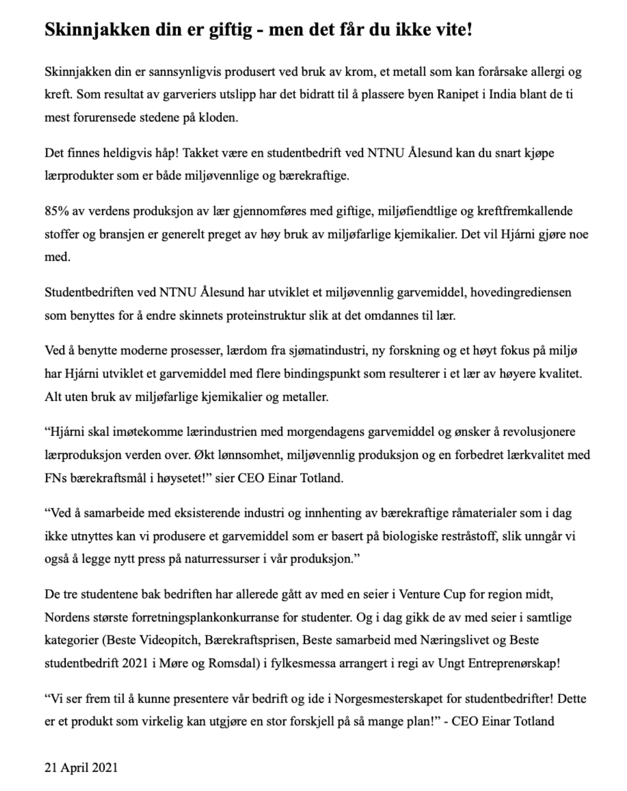 – Dette er helt fantastisk, sier daglig leder i Hjárni SB, Einar Totland. - Vi har hele veien hatt mål om å gjøre alt rundt Hjárni så gjennomført og veldokumentert som mulig. Produktet vårt er helt unikt, og vi kan virkelig gjøre en forskjell med tanke på miljøet og for arbeidere i lær-industrien. Å få bekreftet at andre ser potensialet, mulighetene og omfanget av dette er fantastisk! Vi er klare til å satse videre, forteller en entusiastisk Totland.