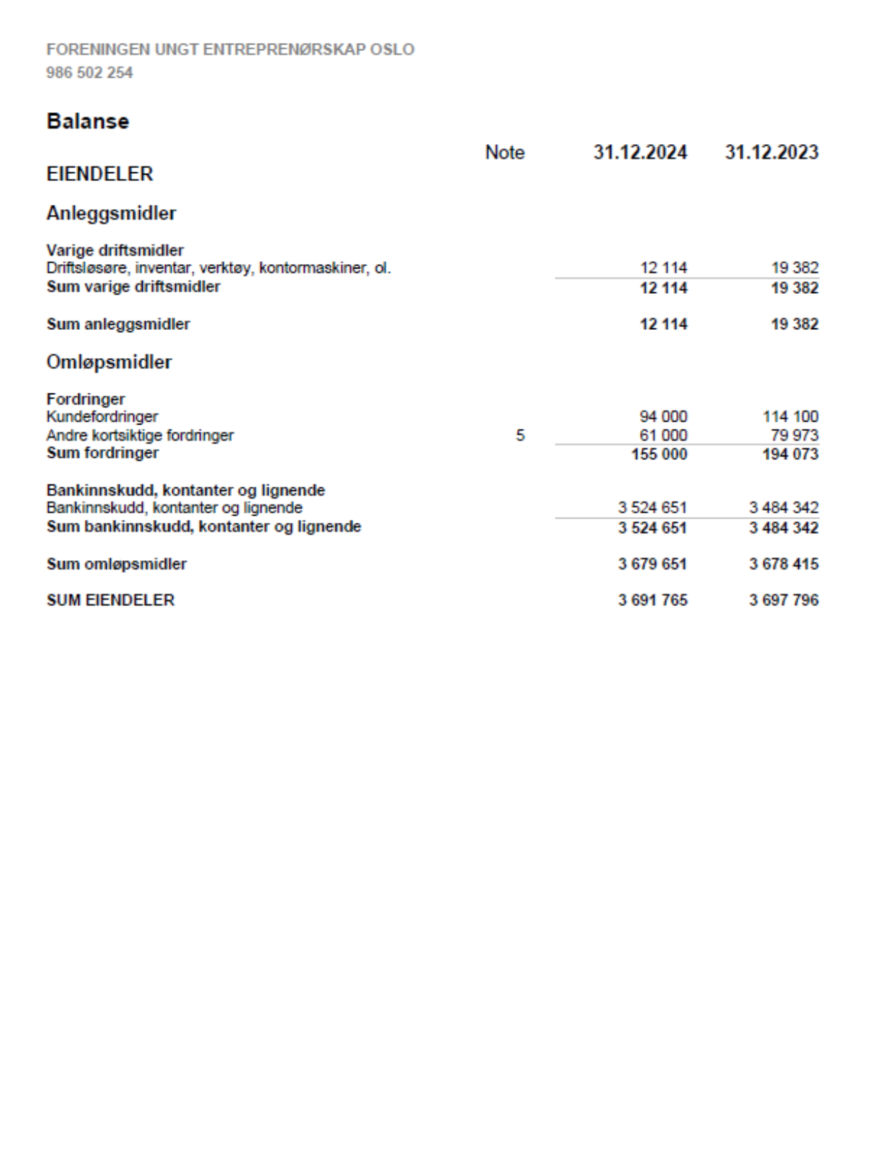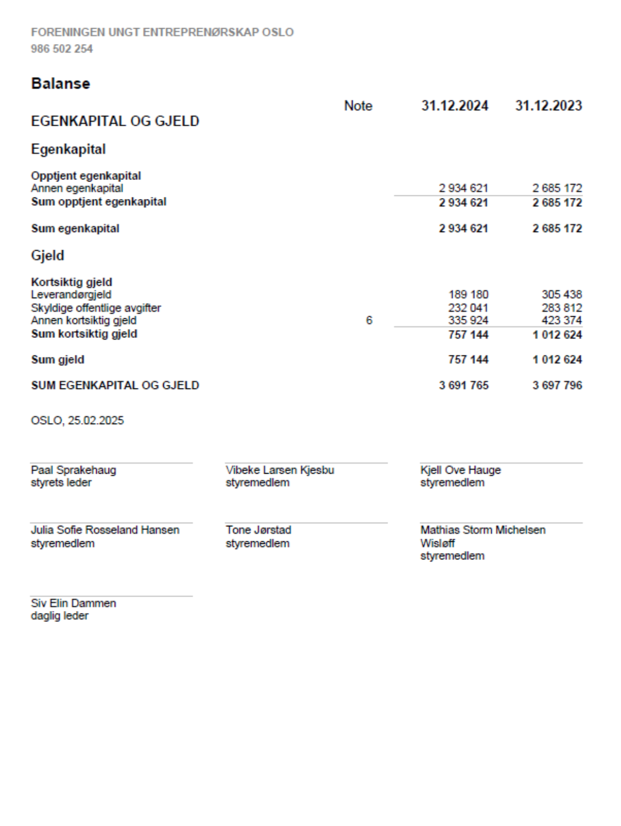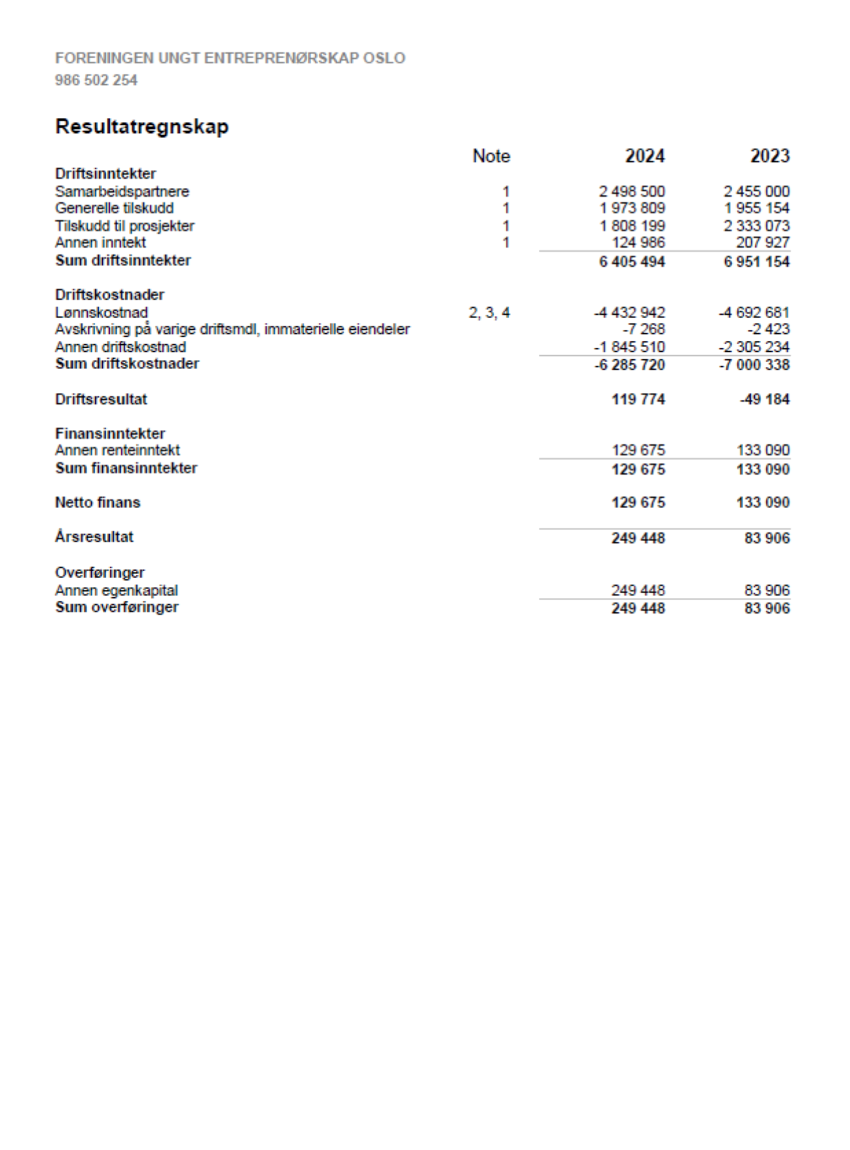 Økonomisk har det vært utfordrende da støtten fra NFD ble gjort søknadsbasert, og det var helt frem til september usikkerhet rundt størrelsen på deres bidrag. Vi unnlot derfor å sette inn vikar for én i fødselspermisjon, og har løst disse oppgavene med eksisterende bemanning. Vi har likevel omtrent like stor aktivitet for både Elevbedrift og Studentbedrift som i 2023. Vi har 5% nedgang for Ungdomsbedrifter, men ser at årsaken i stor grad er utenfor vår kontroll. Vi har en nedgang i