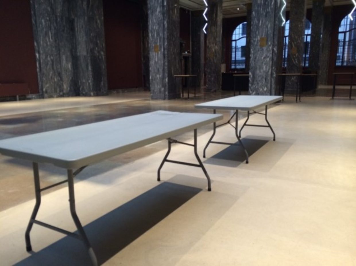 To elevbedrifter må dele ett bord. Elevene kan bruke et lite areal bak og på siden av bordet hvis de ønsker det. Det skal ikke bygges en utstilling og det er ingen vegger å benytte.