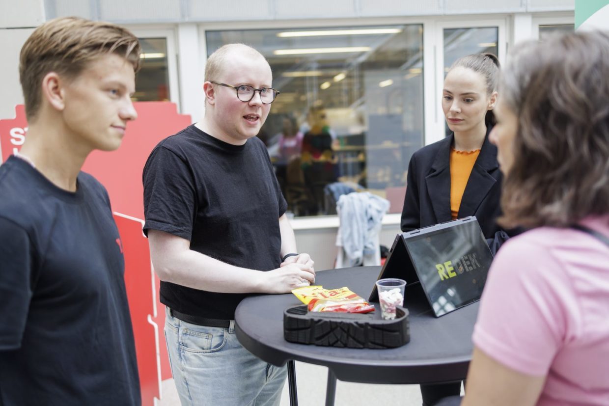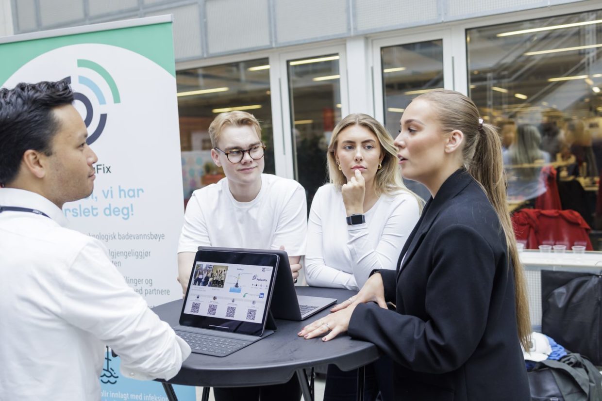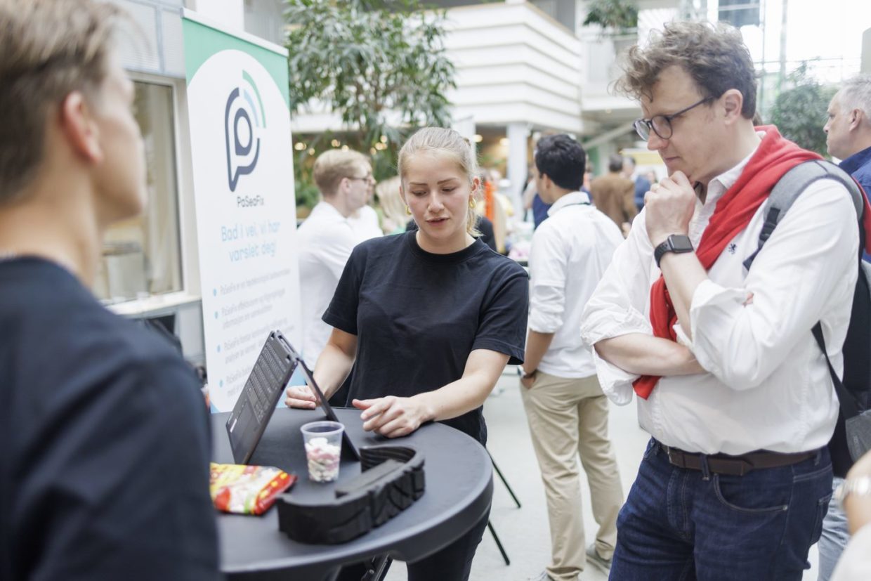 Onsdag morgen var studentbedriftene og andre aktører fra startup-Norge på plass på stand på torget i Forskningsparken. Her får PaSeaFix SB besøk av komiker og konferansier Hallvard Dyrnes på stand, som senere ga dem den uformelle prisen "Mest direkte pitch på stand".
