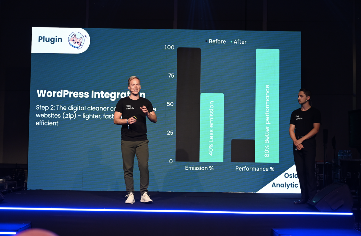 - Vi leverer kalkulatorer, analyser, miljøvennlige servere som er drevet av norsk vannkraft, i tillegg til en plugin som klarer å redusere hele utslippet med 40% og samtidig øke ytelsen på nettsiden med 80%.