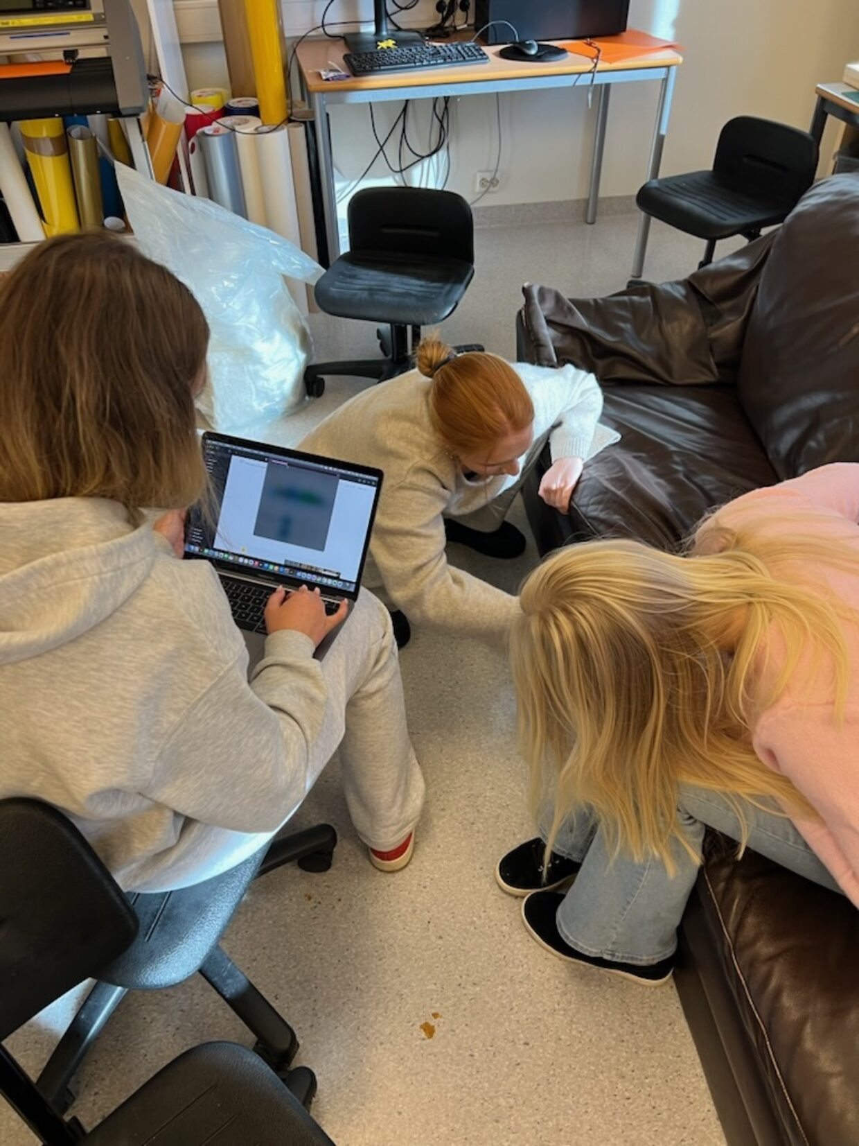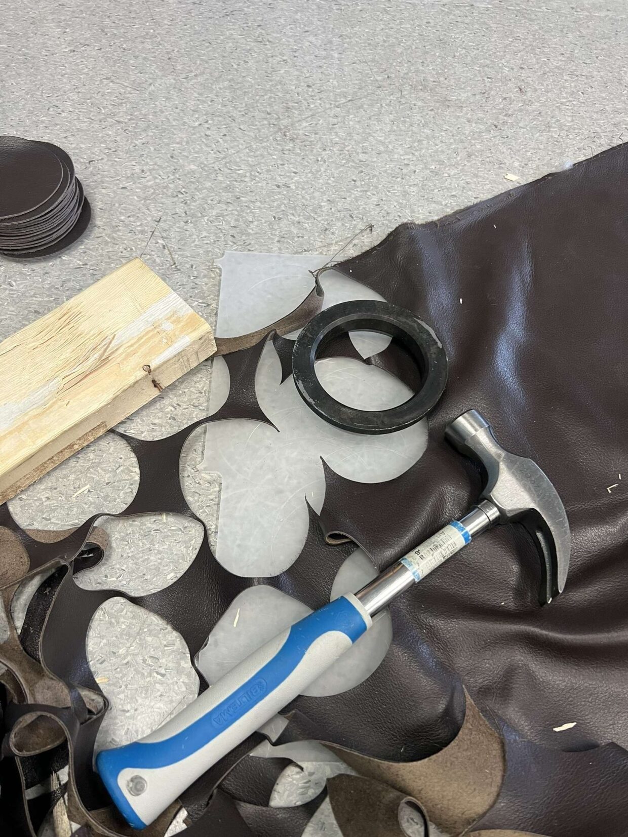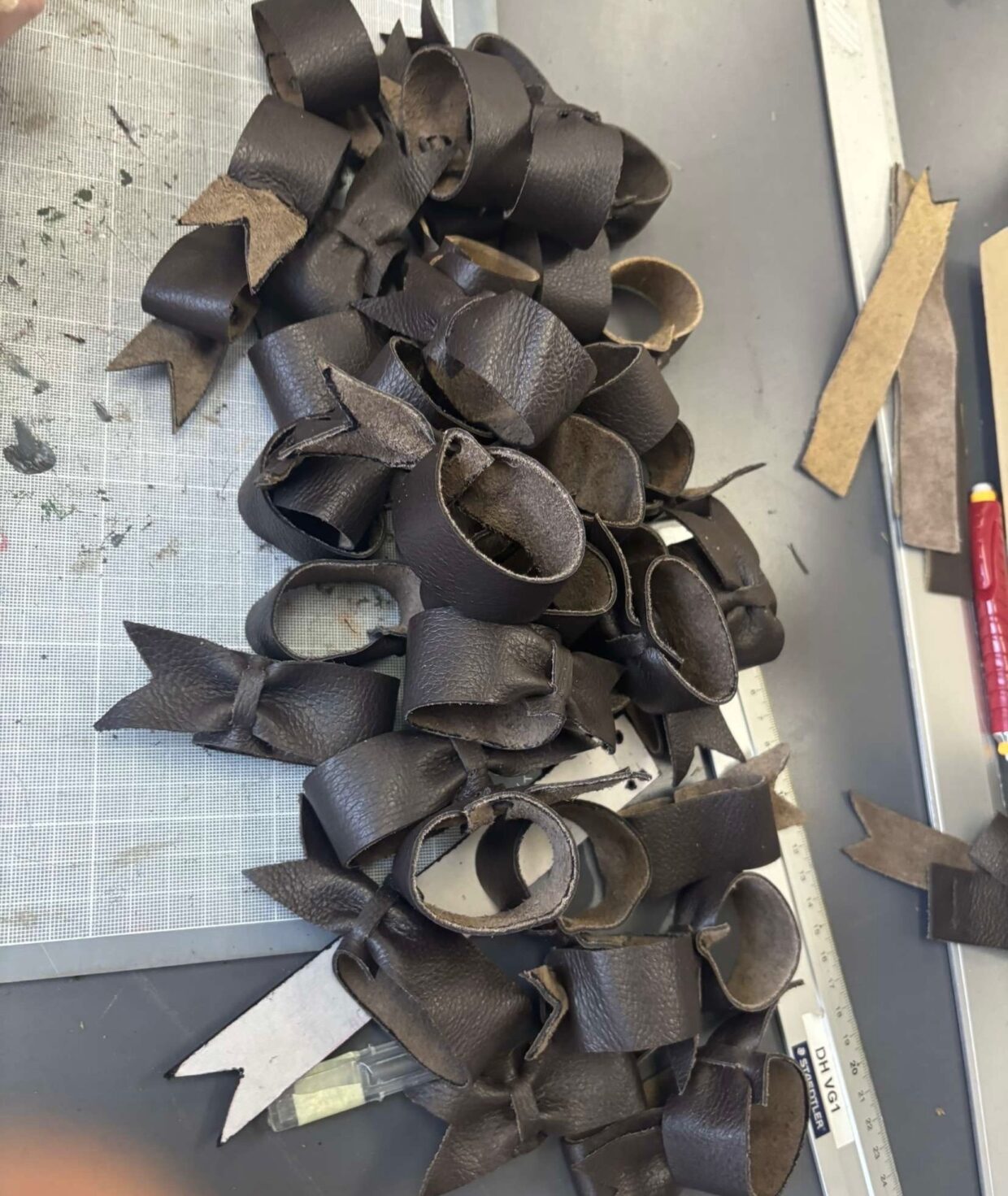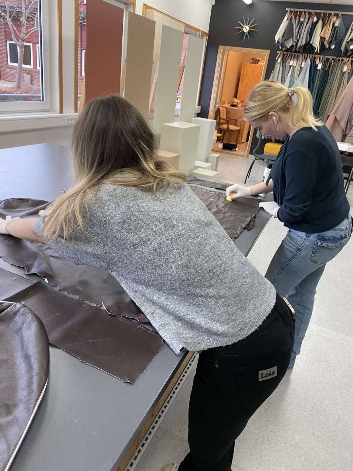 Med kreativet og en gammel skinnsofa, imponerer jentene med trendy skinnprodukter til ditt hjem! Ikke bare lager de produkter i skinn, de bruker også stoppen og trevirke i sofaen gis bort til en annen avdeling ved skolen.