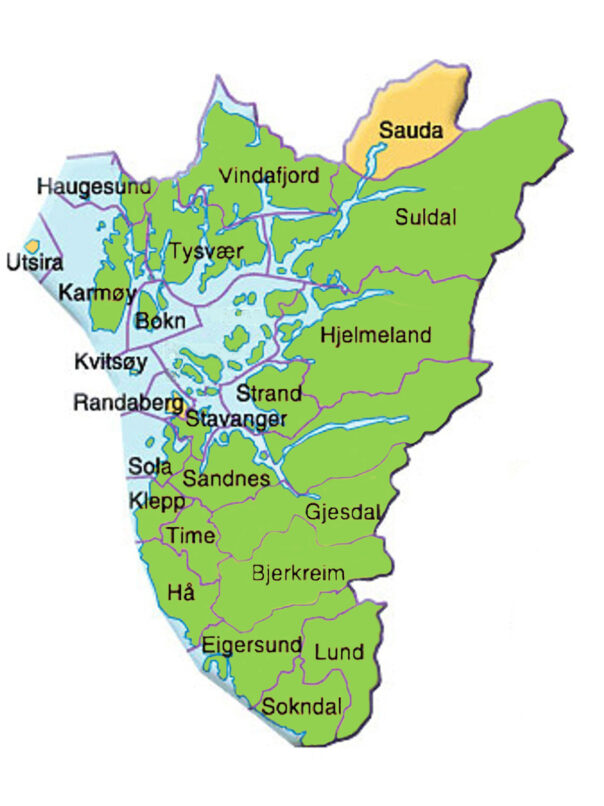 Vindafjord, Tysvær, Sveio, Haugesund, Karmøy, Bokn, Suldal, Hjelmeland, Strand, Kvitsøy, Stavanger, Sandnes, Sola, Gjesdal, Time, Klepp, Hå, Eigersund, Bjerkreim, Sokndal og Lund.