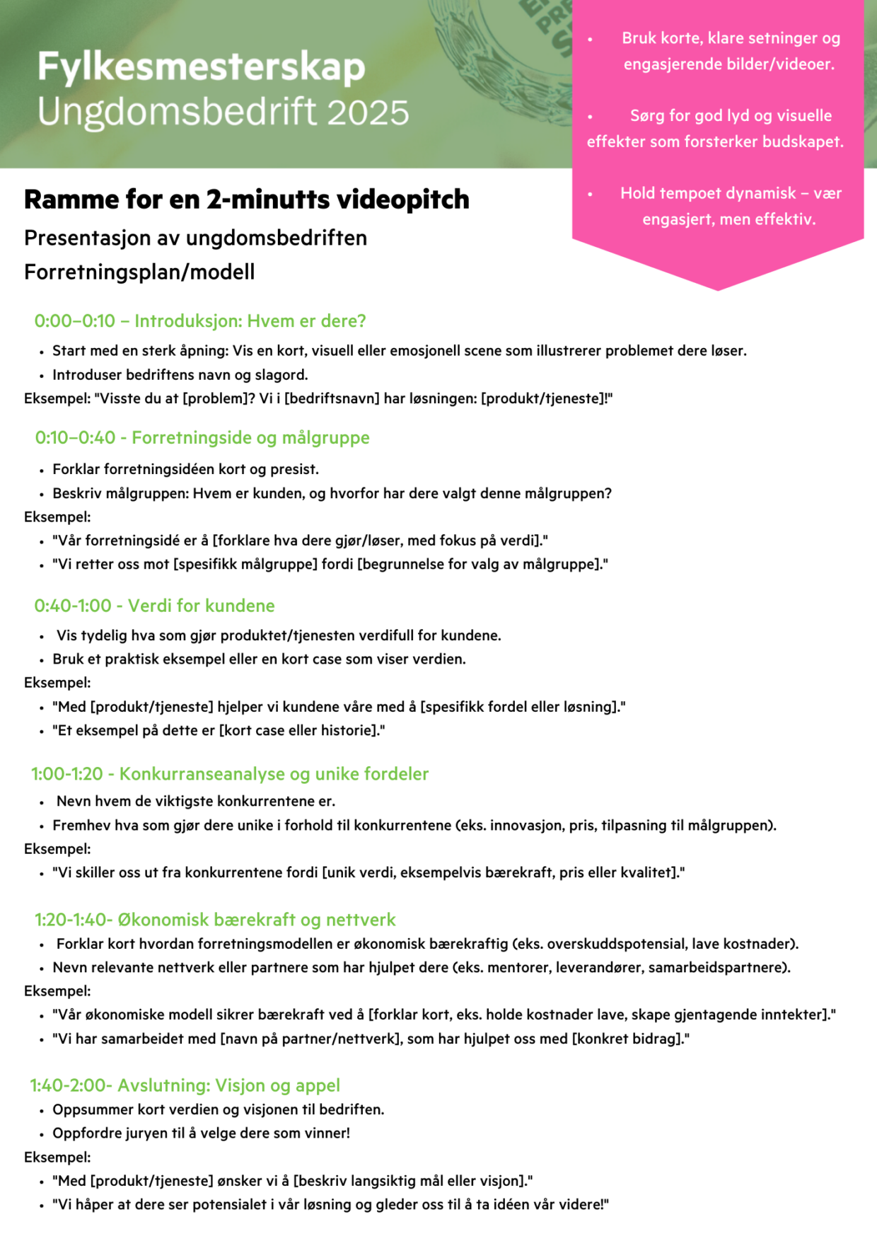 - En video på maks 2 minutter som forklarer og begrunner hvordan det innleverte materialet oppfyller kriteriene.