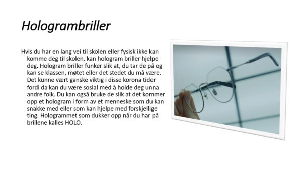 Briller som gjør at du kan se andre mennesker foran deg som hologram. Da kan du være sosial eller delta i møter og undervisning selv om du sitter hjemme.