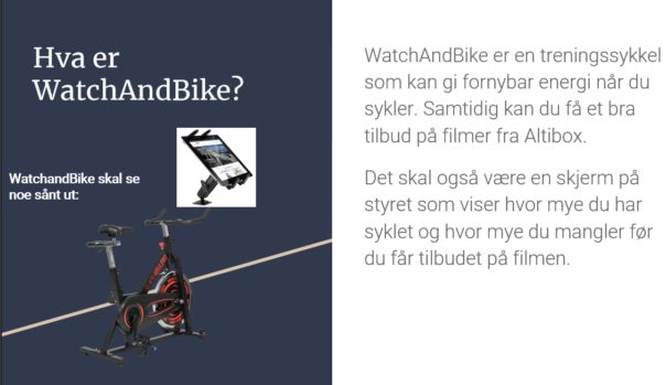 Treningssykkel som gir fornybar energi når du sykler. Jo mer du sykler, jo mer poeng får du. Poengene kan byttes inn i gratis filmer og serier fra strømmetjenester. Målet er at du holder deg i aktivitet når du er i karantene samtidig som du slipper å mase på foreldrene dine om å få se på film!