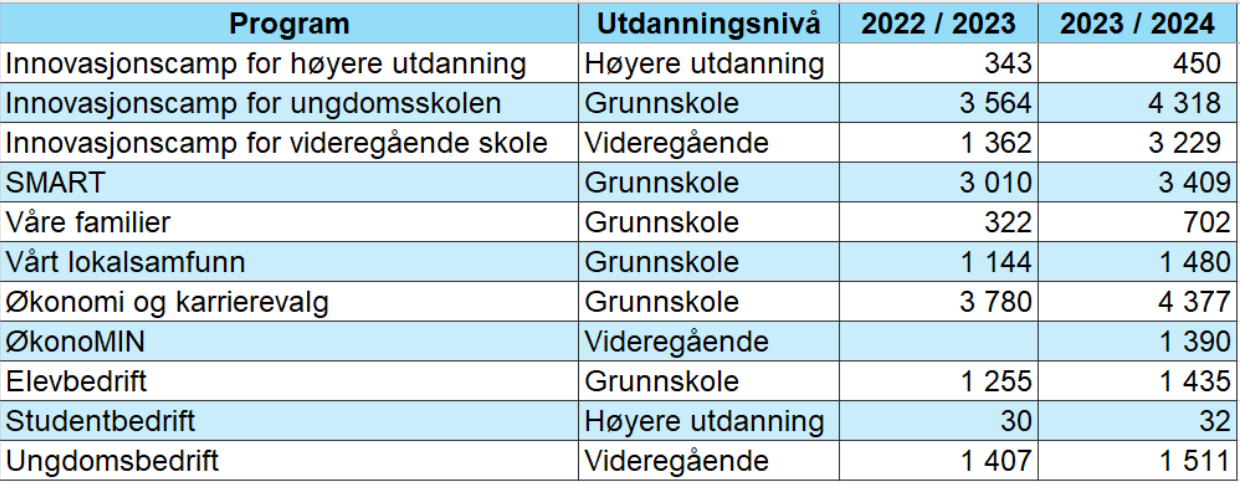 Entreprenørskap handler om å se muligheter og omsette dem til handling, og dette må starte i skolen. Gjennom våre programmer som Elevbedrift og Ungdomsbedrift har vi gitt over 2.500 elever verktøyene de trenger for å utvikle kreativitet, samarbeidsevner og en forståelse for verdiskaping. Det er inspirerende å se hvordan elevene tar eierskap til læringen sin, kobler teori med praksis og skaper løsninger som er både innovative og samfunnsnyttige. Vi vet at slik læring styrker selvtilliten og ansvarsfølelsen – egenskaper som samfunnet vårt trenger mer enn noensinne.
