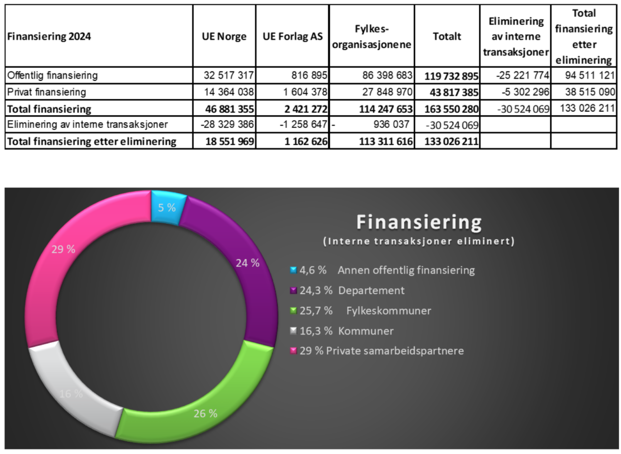 Interne transaksjoner er eliminert for å presentere netto finansiering. Disse transaksjonene omfatter internfakturering samt midler som UE Norge mottar og viderefører til fylkesorganisasjonene og datterselskapet UE Forlag AS