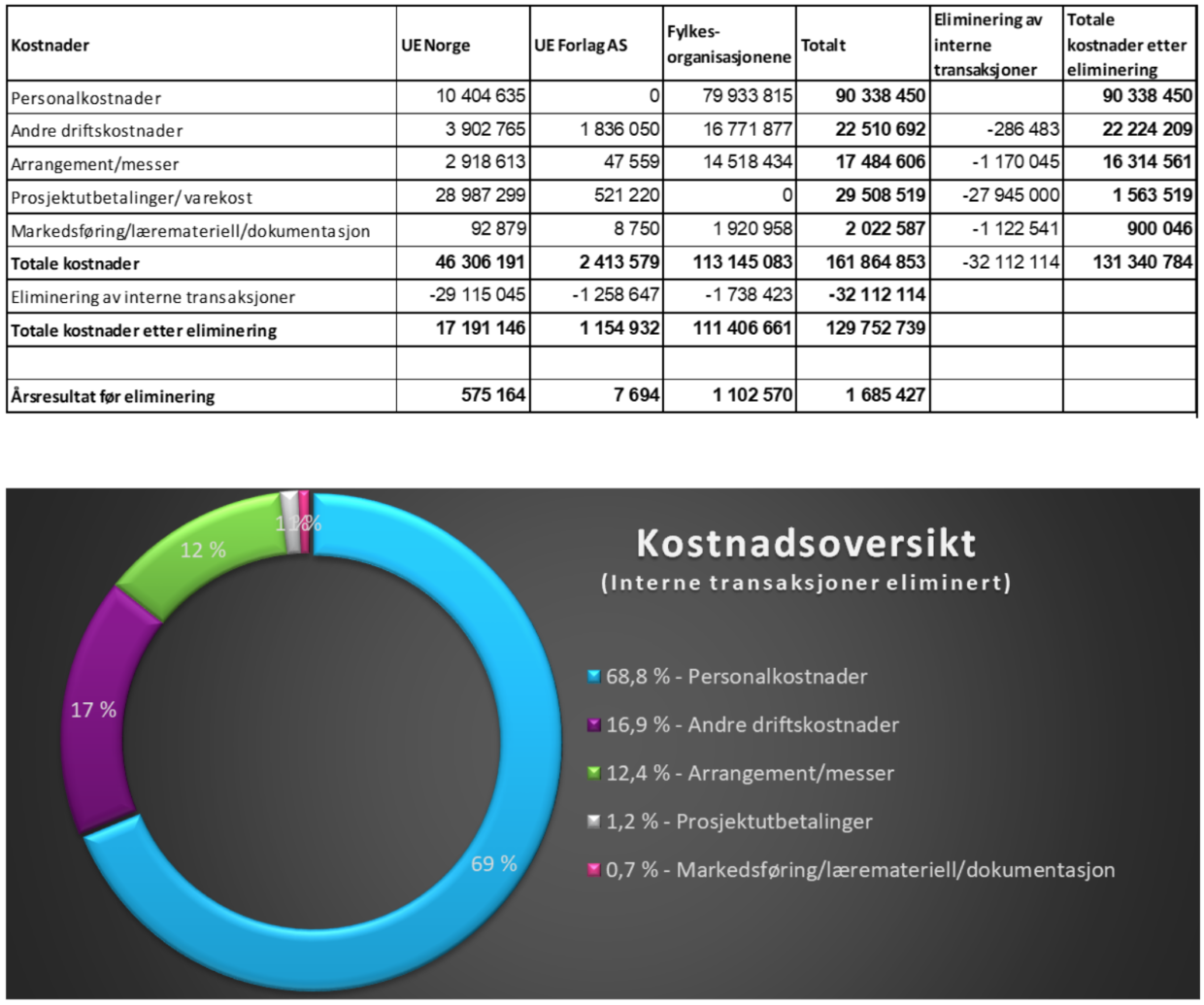 For å presentere netto kostnader på organisasjonsnivå er interne transaksjoner eliminert. Disse transaksjonene inkluderer interne overføringer av midler som UE Norge mottar og videreformidler til fylkesorganisasjonene samt til datterselskapet UE Forlag AS. I tillegg er interne overføringer og viderefakturering mellom fylkesorganisasjonene eliminert for å gi et mer presist bilde av organisasjonens faktiske kostnadsnivå.