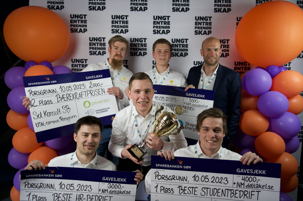 Det var Sol Konsult SB fra USN, fakultet for teknologi, naturvitenskap og maritime fag (TNM) ved campus Porsgrunn som stakk av med den mest prestisjefylte prisen Beste Studentbedrift. Sol Konsult SB vant også Gunnar Knudsen prisen – Beste Innovasjon og Beste HR bedrift, i tillegg til andre plass i bærekraftsprisen.