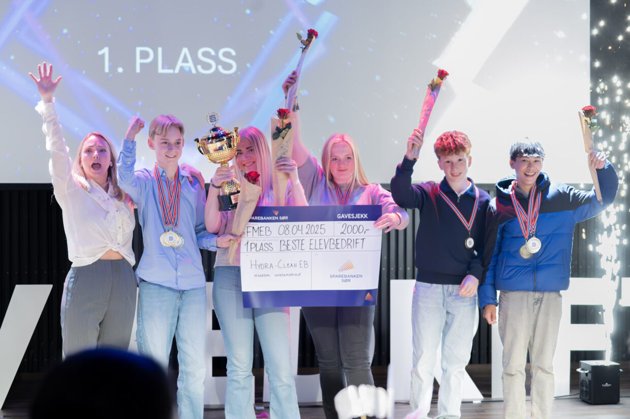 Bamble ungdomsskole, 8. april 2025: Foran et fulltallig publikum stakk elevbedriften Hydra-Clean EB fra Nissedal skole av med tittelen Vestfold og Telemarks beste Elevbedrift i Fylkesmesterskapet for Elevbedrift 2025. De ble også vinner av kategorien Mindre Plast EB og kom på andre plass i kategorien Beste Grønne Entreprenører. Hydra-Clean har tatt tak i ett av de største miljøverstingproblemene, - nemlig plast i havet. Ved hjelp av KI lærer deres havbunnsrobot å sortere og plukke opp søppelet, mens den lar tang, tare og annet på havbunnen bli igjen. Elevbedriften har tenkt på alt, til og med hvordan de skal håndtere å få ladet roboten.