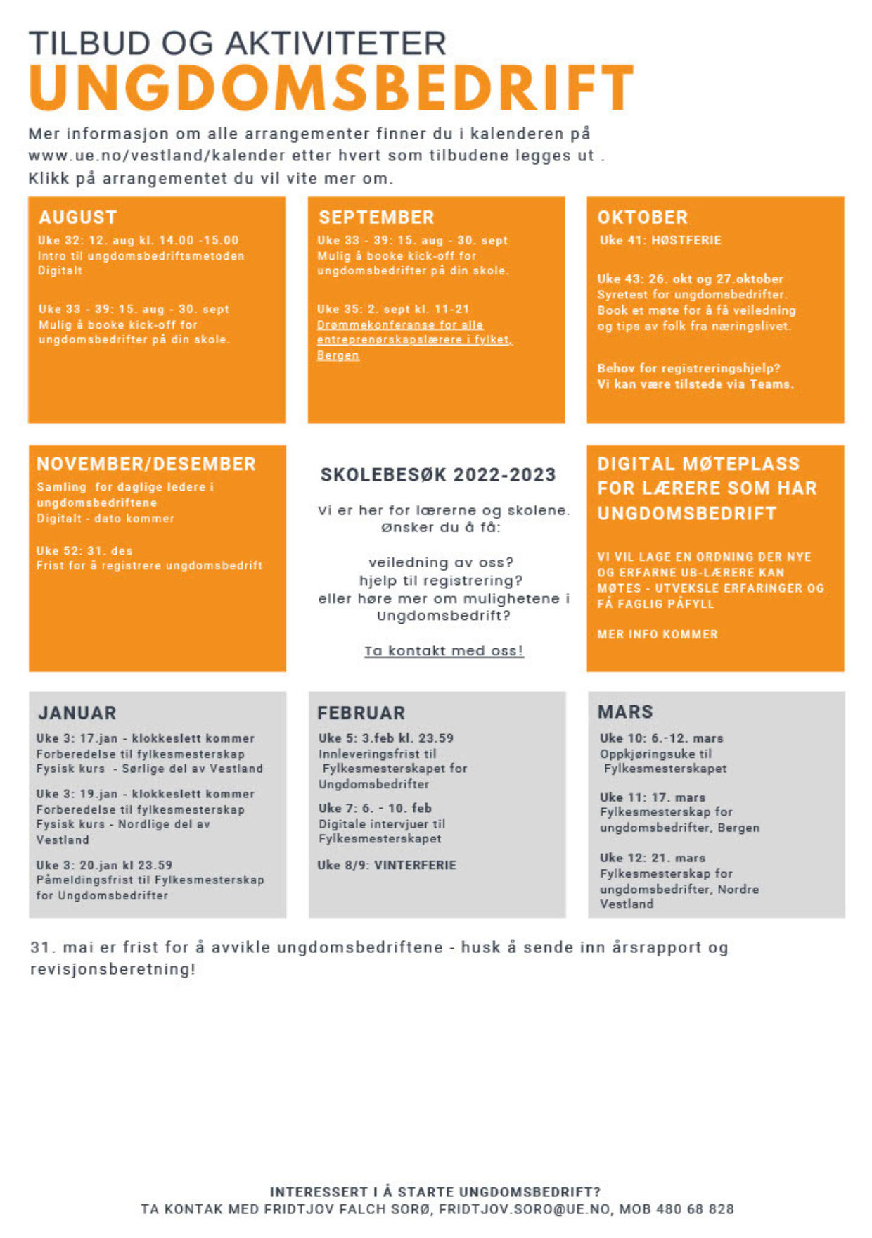 Ønsker du at vi skal komme til din skole for å holde kick-off for dine elever som skal starte ungdomsbedrift? Du kan booke dato ved å fylle ut skjema her, eller sende en mail til fridtjov.soro@ue.no eller din kontaktperson.
